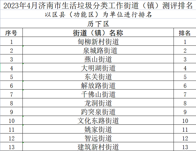 4月份,全市生活垃圾分类工作取得较好成效的街道(镇)有:历下区甸柳新村街道、市中区杆石桥街道、槐荫区张庄路街道、天桥区天桥东街街道、历城区唐冶街道、长清区马山镇、章丘区圣井街道、济阳区回河街道、莱芜区高庄街道、钢城区颜庄街道、平阴县锦水街道、商河县沙河镇、济南高新区孙村街道、南部山区西营街道、济南新旧动能转换起步区太平街道等。