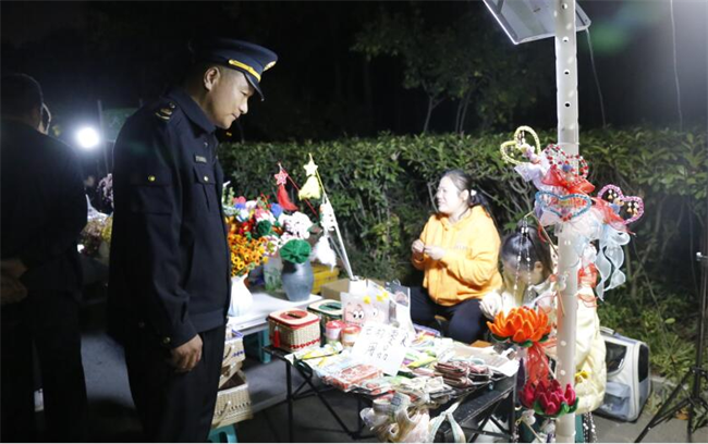 “这是我家自己种的绿色无公害蔬菜,豆角、白菜、黄瓜都是新鲜的,你们带点尝尝?”周家连是第一个响应流动摊位服务区建设的蔬菜摊主:“以前在小区门口售卖,时不时就会被举报,阻塞小区交通的同时,也给城市管理带来了麻烦,前几天听执法人员说这里开设夜市,我跟老伴第一时间就找了过来,拿到了摊位编号。”