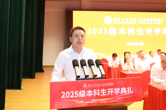新生家长代表、山东创投土地开发整理有限公司总经理王庆华结合自身经历与家庭故事,与同学们分享了成长与求学的感悟,寄语同学们要心怀感恩、勇于探索、看齐榜样、坚韧前行。