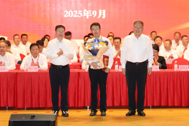 校(院)党委书记吴衍涛、校(院)长段培永为第四届杰出校友代表徐楠、杨峰、陶新永颁发奖牌、证书并送上鲜花。