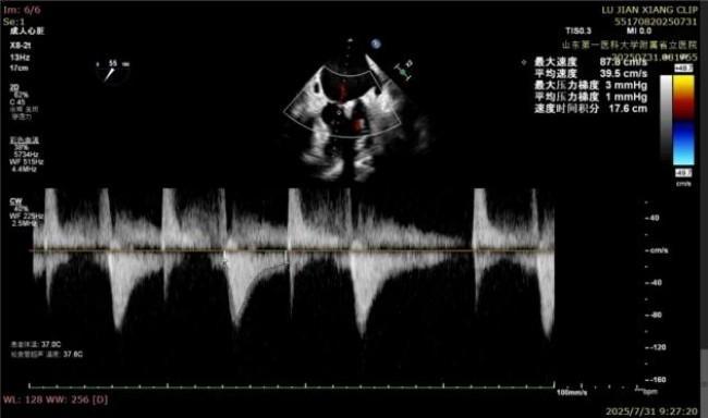 手术过程中,麻醉与围术期医学科副主任医师马金本确保麻醉过程平稳。心脏大血管外科主治医师董明亮穿刺股静脉置入血管鞘,并在心脏超声科梁皓主任及段福建教授TEE引导下,顺利穿刺房间隔,房间隔穿刺高度4.9cm。随后,在王安彪主任以及刘洋教授指导、心脏超声科梁皓主任TEE引导下,董明亮医师沿输送系统将延展呈“一字型”状态的国产夹合器送至左房,缓慢关闭夹合器并进行弹道测试。调整夹合器位置和方向后,董明亮医师再次将夹合器延展呈“一字型”完成跨瓣,避免发生腱索缠绕,成功捕获瓣叶后关闭夹合器,二尖瓣反流显著下降。夹合器完全解离后,超声示二尖瓣反流程度显著下降,残余反流0,平均跨瓣压差1mmHg,手术圆满成功。