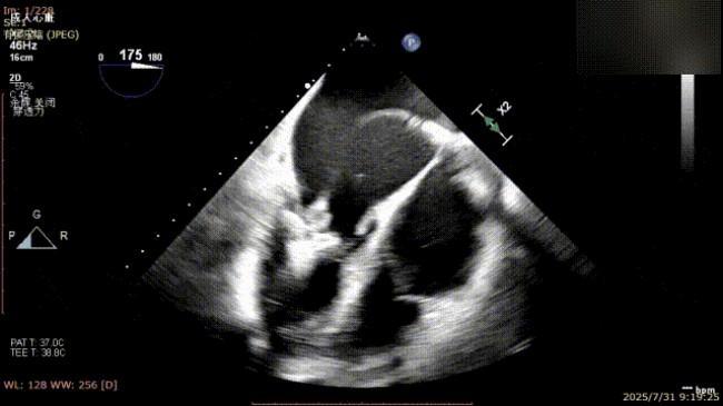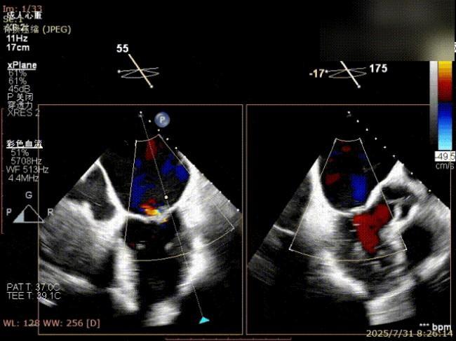 患者为75岁男性,因“活动后胸闷1月余”入院,经诊断存在慢性心力衰竭、二尖瓣重度反流(4+)、后叶脱垂、部分腱索断裂、三尖瓣重度反流、重度肺动脉高压等多种高危病症,同时合并高血压病3级、颈动脉硬化、支气管炎及肺结节等基础疾病。入院后,科室予以药物积极纠正心功能治疗,并完善冠状动脉CTA检查,结果显示冠状动脉轻度狭窄。经心脏大血管外科会诊,建议行二尖瓣手术治疗。由于患者高龄、心功能差、存在桶状胸及肺功能不佳等问题,传统开胸手术风险极高。经多学科讨论,团队最终决定行创伤小、恢复快的经皮二尖瓣钳夹术(TEER)。该术式作为高龄及外科高危的二尖瓣重度关闭不全病人的有效治疗方式,具有创伤小、术后恢复快等优势。