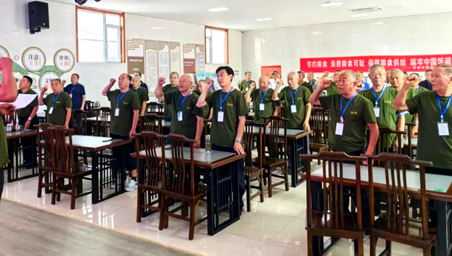 默哀仪式结束后,优抚对象们面向党旗,庄严举起右拳,再次宣读入党誓词。“我志愿加入中国共产党……随时准备为党和人民牺牲一切,永不叛党。”铿锵有力的誓言在餐厅内回荡,许多老人眼中闪烁着泪光。他们用一生践行了当年的承诺,如今虽已年迈,但初心未改、信仰依旧。