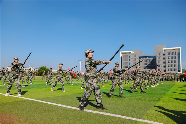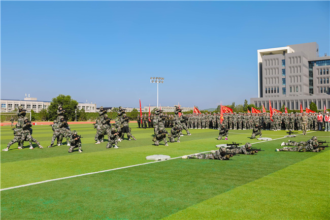 军体拳、擒敌拳、刺杀操、应急棍、捕俘刀等特色科目方队依次上阵,尽显英姿。军体拳方队融合拳打、脚踢、摔拿,每招皆含技击深意,彰显新生力量与技巧。擒敌拳方队动作流畅连贯,以击打、擒拿技法展现实战威力。刺杀操方队凭突刺、防刺等招式诠释“快、准、狠”,近战锋芒震慑全场。应急棍术“棍翻飞,身相随”,恢宏气势突显拼搏风采。捕俘刀方队喊着“勇者无惧”口号,短刀招式利落,展示果敢战斗魂。各方队演示刚劲有力,既展现格斗魅力,更涵育国防意识与进取精神。压轴登场的是战术示范方队,他们模拟战场环境,进行了精彩的单兵战术、小队协同搜索前进及红蓝对抗演习,无人机侦察、机器狗伏击等新质军事元素融入其中,展现了济职学子的战术素养、集体精神和心理韧性。