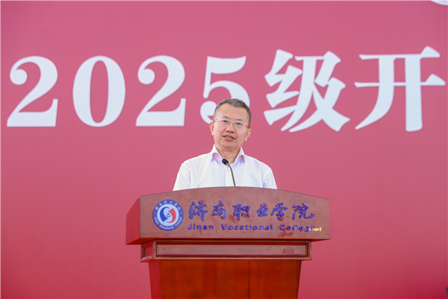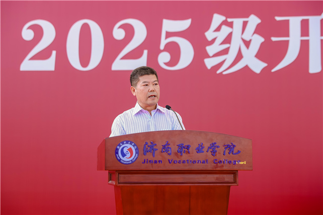苏旭勇以“志存高远梦启济职,奋勇争先强国有我”为题发表讲话。他充分肯定了2025级新生在为期14天的军事训练中取得的优秀成果,介绍了学院的奋斗历程和取得的相关成绩,深情讲述了今年三月济职学子风雪中助推救护车感动全网的善举,“济职义工”学雷锋志愿服务团坚持12年奉献社会的温暖故事,生动阐释了济职人的奉献、担当和传承。