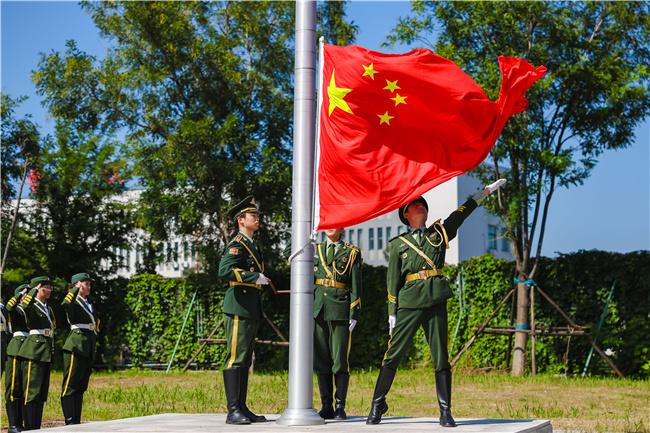14时,大会在庄严的国歌声中拉开帷幕,五星红旗冉冉升起,全体师生肃立齐声高唱国歌,激昂的歌声响彻操场。