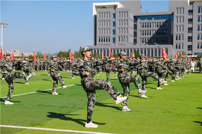 随后,激动人心的军训成果展示正式开始。国旗护卫队率先出场,步伐铿锵、英姿飒爽,展现了济职学子的忠诚与担当。各系部代表连队依次进行会操展示,立正稍息、停止间转法、跨立、蹲下与起立、敬礼、齐步与立定等一系列军训动作整齐划一、刚劲有力,展现出同学们军训淬炼后斗志昂扬、纪律严明、团结向上的精神风貌。