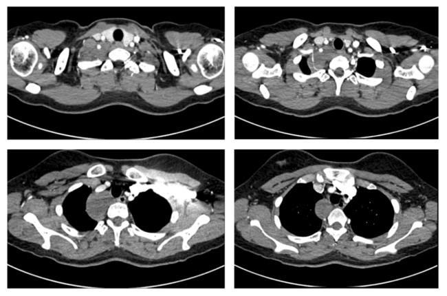 原发/累及胸廓出口部的肿瘤起源复杂,常见的有后纵隔神经源性肿瘤,肺源性肿瘤,胸膜纤维瘤及肉瘤等,其中神经源性肿瘤及肺源性肿瘤占绝大部分。成人常见的胸廓出口部巨大肿瘤多为良性神经源性肿瘤,对于中老年患者,多数为神经鞘瘤,而对于青年患者则神经纤维瘤相对多见。患者常无明显症状,肿瘤较大时可出现相应组织结构受压所致的症状,如肿瘤压迫颈部交感神经所致的Horner综合征等。而对于恶性肿瘤,如肺上沟瘤等,患者往往会在肿瘤外侵时出现上肢疼痛、肌力下降、胸背部不适等症状。