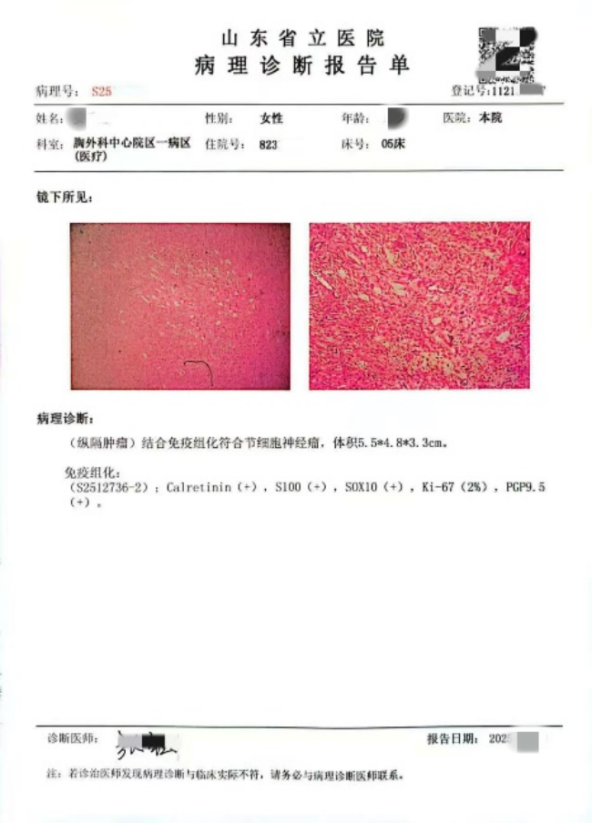 患者是一名来自新疆的19岁女生,在校期间一次常规体检中偶然发现后纵隔肿物。因肿物位置特殊,患者及家属在当地多家医院辗转求医,最终慕名到省立医院刘相燕主任处就诊。入院后,患者完善了胸部CT平扫+增强检查,影像显示,肿物上缘至甲状腺水平,向下沿气管及食管走行,累及长度近6厘米,与右锁骨下动脉关系密切,几乎完全包绕椎动脉。此外,肿瘤已累及交感神经,紧邻臂丛神经,术中稍有不慎极易损伤重要的血管、神经,导致严重的并发症。这极大增加了手术难度与风险,对手术团队提出了挑战。针对患者复杂的病情,刘相燕主任带领团队制定了详尽的手术方案,就手术切口选择、术中突发状况应急处理以及术后生命体征与神经功能监测等环节均进行了充分讨论与周密准备。