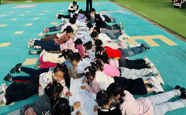 在“中华题库十八问”问答游戏中,孩子们踊跃抢答,孩子们在轻松的互动中对祖国的认知又多了几分。最受孩子们喜爱的当属“师友共画一幅画”环节。老师们提前备好画纸、画笔和颜料,孩子们围坐在一起,有的蘸取红色画五星红旗,有的用黄色勾勒天安门轮廓,有的用绿色描绘万里长城,还有的在画纸上写下歪歪扭扭的“祖国妈妈生日快乐”,一幅幅色彩鲜艳的画作里,满是孩子们对祖国最纯真的祝福。