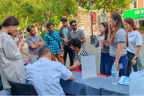 现场还有几位在附近生活的巴基斯坦友人,他们听说有中医诊疗,专程前来咨询身体调理问题。在翻译的协助下,友人们向医生描述了近期常感肠胃不适、精神不济的情况。医生耐心为他们号脉,仔细询问饮食偏好与作息习惯,判断存在脾胃运化较弱的情况,随后建议减少生冷食物摄入,搭配小米粥、南瓜等温和食材调理,还分享了按揉足三里穴健脾的方法。友人们认真记录调理建议,用不太流利的中文说着“谢谢”,并对中医仅通过“摸脉”就能准确判断身体状况的独特方式连连称奇。