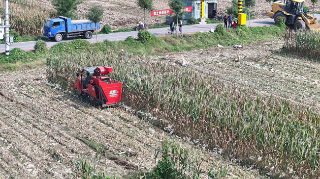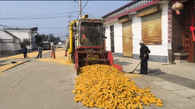 田间地头,党员干部带领秋收突击队分片统筹、有序调度,有的协助农户搬运粮袋,有的指导集中晾晒,现场一片繁忙有序。镇农技人员深入一线,化身“抢收智囊”,实地查看玉米成熟度,指导农户优化收割流程、调整农机参数,并现场讲解晾晒技巧,把实用技术送到田间场院。农技团队还实时协调调度收割机、运输车等设备,全力提升晴好天气下的作业效率,为秋粮丰收织密“保障网”。