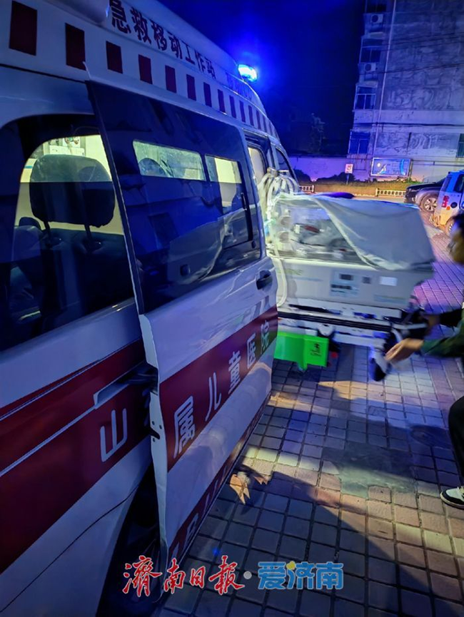 转运途中,团队成员全程守护。转运呼吸机为雯雯的生命通道保驾护航,食管持续减压及时引流唾液,监护仪密切追踪生命体征,输液泵则将维系生命的静脉营养一滴一滴输入她的体内。历经两个多小时的车程,出生仅7小时的雯雯被安全送达山东大学附属儿童医院新生儿重症监护病房(NICU)。