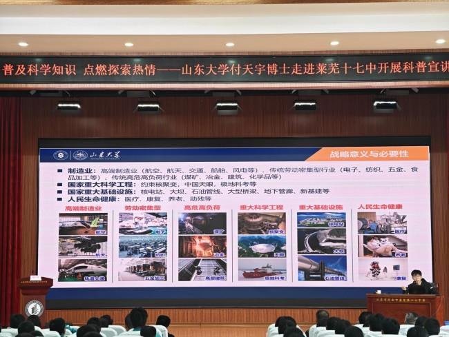 随后,山东大学控制科学与工程学院博士后、机器人研究中心助理研究员付天宇博士聚焦机器人科普主题展开讲解。付博士同时担任济南市工业和信息化局机器人产业发展办公室成员,长期深耕机器人复杂作业技能学习与优化领域,尤其在机器人柔性物体操作方向开展了大量前沿研究工作。讲座中,他用通俗易懂的语言解读机器人技术的发展现状与未来趋势,结合自身主持或参与的5项国家级省部级项目、2项企业自研项目,以及发表的10篇SCI/EI论文、15项授权/申请发明专利和2项软件著作权成果,为师生们呈现了一场兼具专业性与趣味性的科技盛宴,极大激发了同学们对人工智能与机器人领域的探索热情。