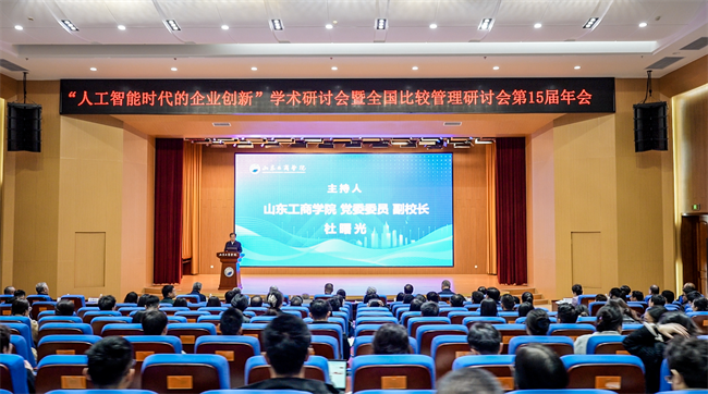 近日,“人工智能时代的企业创新”学术研讨会暨中国企业管理研究会国际比较管理专业委员会第15次年会在山东工商学院举行。来自全国三十余所高校和科研机构的近百位专家学者齐聚一堂,共同围绕AI驱动组织变革、数据要素赋能、数字化转型等前沿议题展开深入交流。山东工商学院党委副书记、校长陶虎,中国社会科学院工业经济研究所企管研究室高中华主任,中国企业管理研究会国际比较管理专业委员会主任委员高闯教授分别致辞。山东工商学院党委委员、副校长杜曙光主持开幕式。