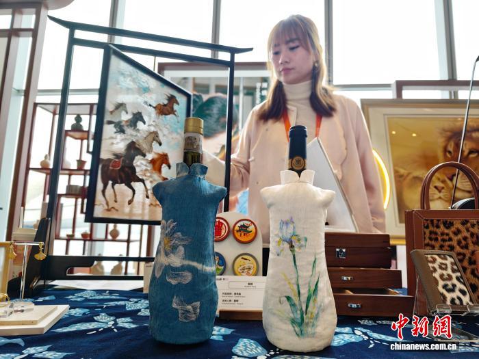 红酒套上用湘绣结合法绣技法绣了法国国花鸢尾花。中新网记者唐小晴摄