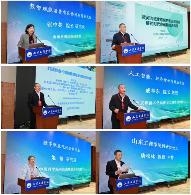 主旨报告环节由山东工商学院科研处处长、经济学院院长唐松林教授主持。山东省宏观经济研究院院长张中英研究员、山东社会科学院副院长李国栋教授、中国科学院地理科学与资源研究所东北亚可持续发展研究中心主任董锁成研究员、北京师范大学经济与工商管理学院院长戚聿东教授、中国科学院科技战略咨询研究院姬强研究员分别以“数智赋能沿黄省区协同高质量发展”“黄河流域生态保护和高质量发展的时代意蕴和推进路径”“共建黄河沿岸绿色长城,促进全流域高质量发展”“人工智能、经济增长与就业前景”“数字赋能气候金融发展”为题作了精彩报告。