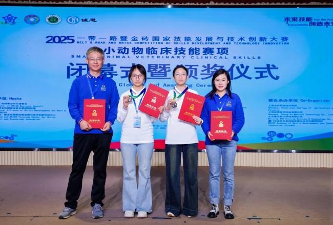 10月31日至11月3日,2025一带一路暨金砖国家技能发展与技术创新大赛首届小动物临床技能赛项在上海农林职业技术学院举办。由农学系教师李成元、郝佳佳指导的侯雨晴、许晓涵两位同学组成的参赛队伍脱颖而出,斩获银奖(二等奖),教师获“优秀指导老师”称号。
