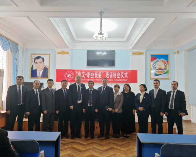 在塔吉克斯坦冶金学院总部,代表团与校长巴霍季尔・纳比(Bakhtiyor Nabi)举行正式会谈,回顾前期合作框架协议落实情况,对“班・墨学院”未来发展进行战略规划并签署合作备忘录。双方明确将依托智能制造、新能源汽车、农业等专业优势,在师生互访、课程开发、学术研究、技术培训等方面开展实质性合作,共同打造中塔职业教育合作典范平台。会谈后,代表团出席了“中文+职业技能”培训结业仪式及“塔吉克斯坦冶金学院-班・墨学院”揭牌仪式。