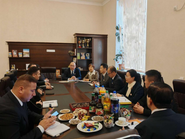 代表团走进塔吉克斯坦国立师范大学,参观该校中国管理中心,与国际关系部负责人穆比尔霍尼・穆明普尔(MUBIRKHONI MUMINPUR)探讨学生实习实训与产学研合作,为师生赴塔实习就业夯实基础。