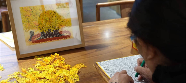 文创店工作人员孙明莲表示:“我们这棵银杏树的文创作品是经过染纸,不掉色不褪色。下一步是刻出来的,在做的过程中,每道工序都得经过认真耐心地创作出来,才能让这棵树,让游客们感到非常地光鲜亮丽。”