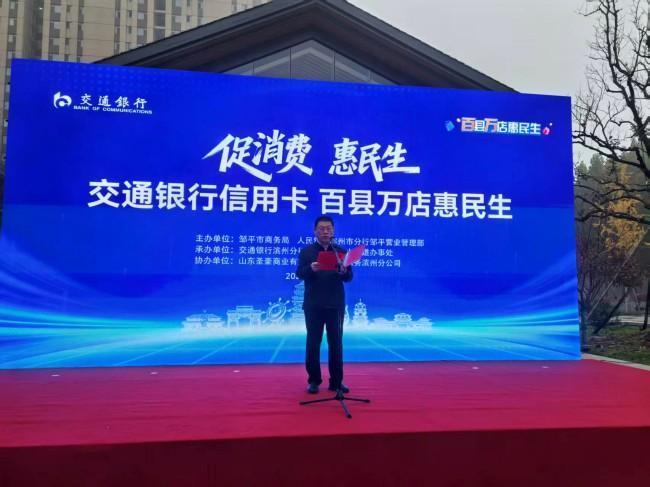 交通银行山东省分行信用卡部总经理董璀璀、邹平市副市长王涛、交通银行滨州分行行长闫家强、邹平市黄山街道党工委书记刘传伟、邹平市商务局党组书记局长夏冰、人民银行滨州市分行邹平营业管理部主任王立强、山东圣豪商业有限公司董事长杜灏之等嘉宾领导出席启动仪式。