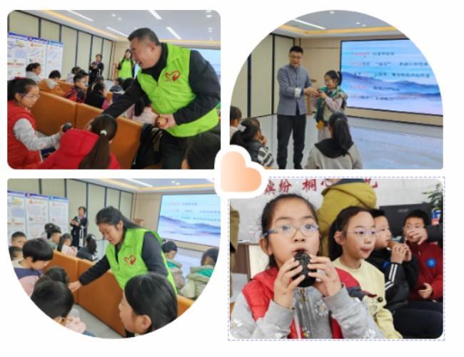 活动伊始,非遗传承人玄家琦老师以一曲明快灵动的埙乐表演拉开序幕,悠扬婉转的古音萦绕现场,迅速营造出浓厚的传统文化氛围,充分调动了青少年的参与热情。活动现场,玄老师通过PPT动态演示与实物展示相结合的方式,系统讲解了埙的千年起源与历史演变脉络,并以“埙有几个孔”“为何埙音或低沉浑厚、或清脆婉转”等趣味问题与青少年积极互动。孩子们专注聆听、踊跃应答,现场互动氛围热烈,充分展现了对非遗文化的好奇与求知欲。随后,志愿者为青少年分发各式埙具,玄老师吹奏示范、耐心指导,孩子们手握古埙认真模仿,一招一式尽显专注,古雅乐声在活动现场缓缓流淌,让青少年初步感受到了埙乐的独特韵味。