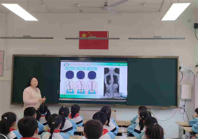 在脊柱健康环节,狄医生通过图像对比,让孩子们直观地看到“弯曲的脊柱”与正常脊柱的区别——正常脊柱像笔直的小树干,而侧弯的脊柱则像长歪了的树干,向一侧倾斜。“那么,如何保护我们宝贵的脊柱呢?”狄医生将预防知识融入实际场景:保持正确坐姿,做到“一拳一尺一寸”;背双肩包,减轻单侧压力;多参加游泳、篮球等对称性运动。她现场带领孩子们练习正确坐姿,大家积极参与,在互动中将健康理念牢记心中。