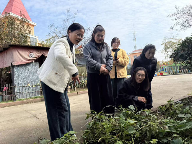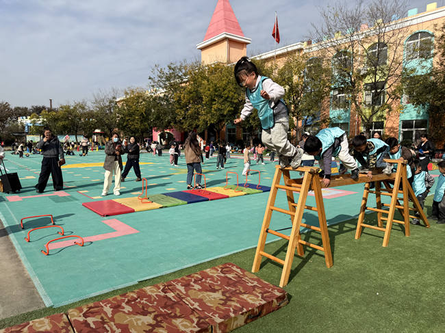 随后,孩子们分组开展的户外自主游戏成为本次观摩的核心亮点。在体能游戏中,孩子们攀爬、跳跃、平衡,尽情释放活力;在自然探索中,他们观察植物、捡拾落叶,感受自然之趣;在合作游戏中,小伙伴们分工协作、互帮互助,体验团队力量。参观教师们深入游戏现场,近距离观察幼儿的游戏状态,详细了解中心幼儿园在户外活动主题生成、游戏进阶指导、幼儿个性化发展支持等方面的实践经验。
