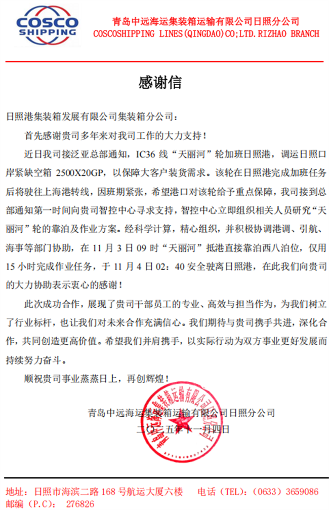 “你们的服务真是太赞了!”日前,客户将一封感谢信送到日照港,对港口的优质服务表示感谢和肯定。