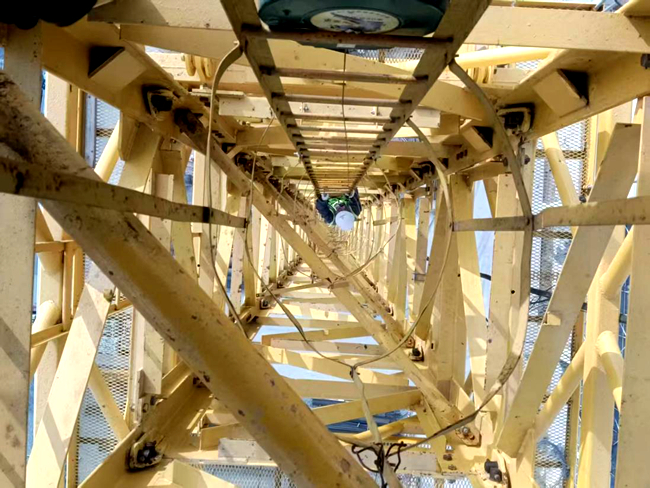 该设备属大型起重机械,塔身高50余米,吊臂长达75米,检验工作主要在高空开展,对检验人员的技术水平、体能及心理素质均提出了较高要求。检验人员需沿狭窄的爬梯攀登至50余米高的塔机顶部,并在高空环境下开展全面细致的检验任务。