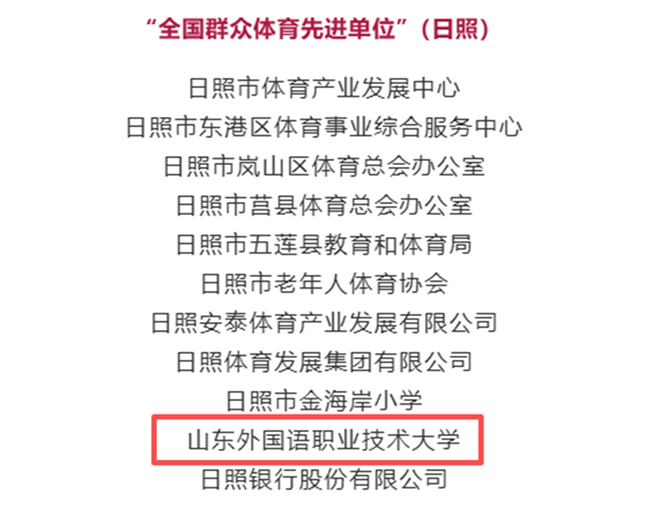 学校将以此为新起点,珍惜荣誉,再接再厉,继续深入贯彻落实全民健身国家战略,不断完善全民健身公共服务体系,在深耕校内体育文化的同时,进一步扩大优质体育资源的社会共享,为培养德智体美劳全面发展的时代新人,为服务地方发展、建设健康中国和体育强国贡献更大力量。(山东外国语职业技术大学)