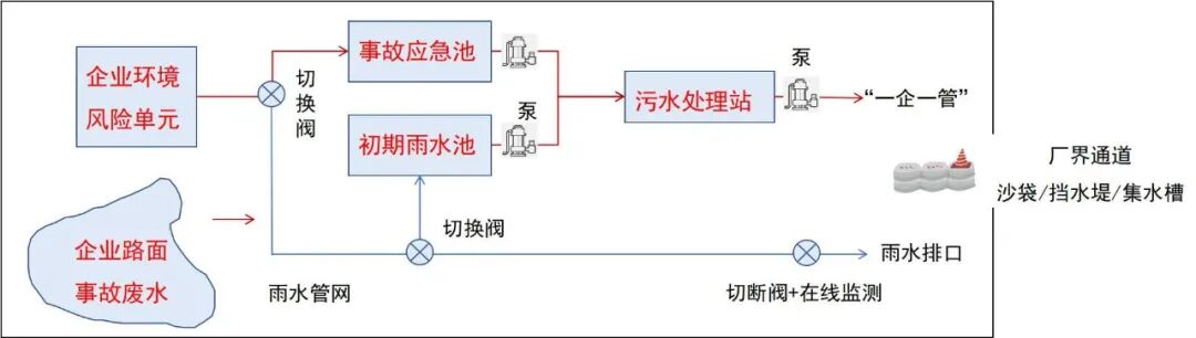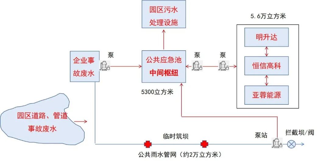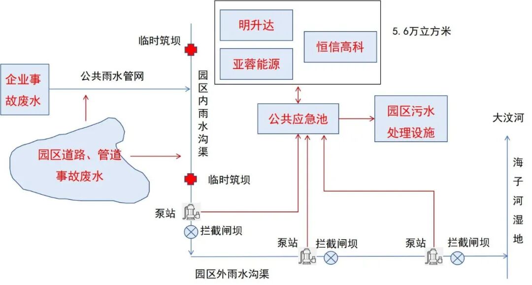 以雨水系统末端拦截转输、公共应急空间扩容为重点,建设完善园区第二级防控体系。在园区两个公共雨水排口建设固定闸坝(阀)和转输泵站,配合雨水明渠临时筑坝,形成2万立方米缓冲空间,具备紧急拦截暂存和转输功能。依托综合管廊架建设专门管道,将恒信高科、晋煤明升达、亚蓉能源等3家企业应急空间(5.6万立方米)互连互通,并纳入园区公共应急空间,实现所有企业事故废水可通过园区公共应急池(中间枢纽)进入3家互连互通企业应急空间,形成覆盖全域的事故废水转输网络。