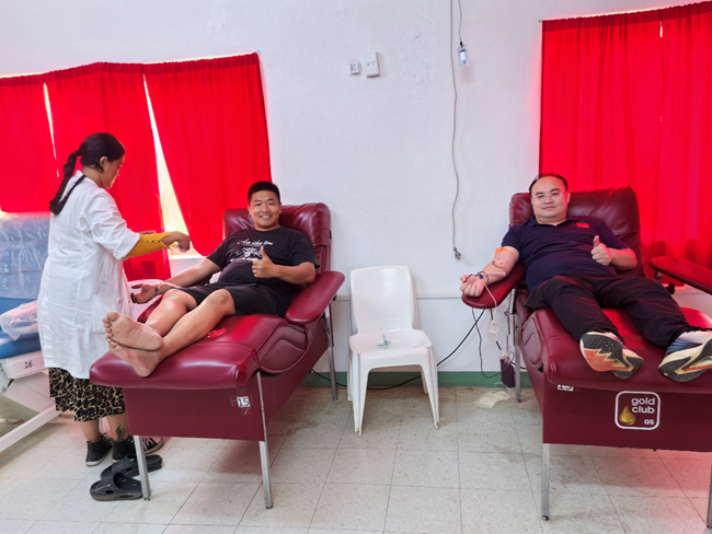 鲁庆阳(右一)为汤加一名登革热合并急性阑尾炎患者献血