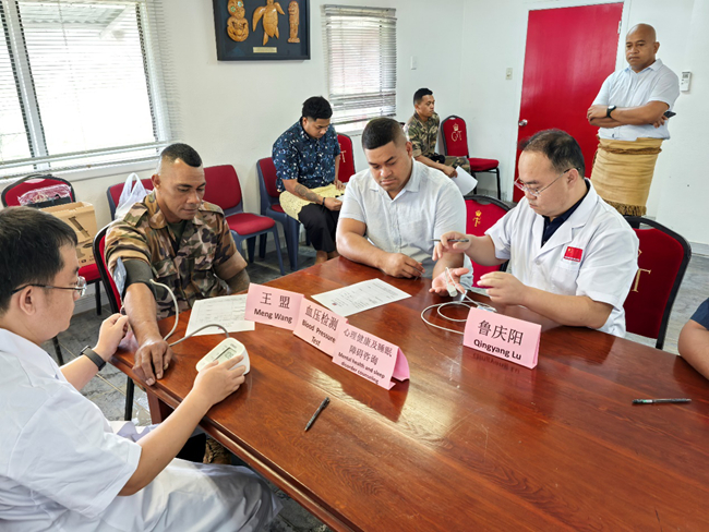 2024年10月7日,鲁庆阳(左一)为汤加当地脑中风患者义诊。受访者供图
