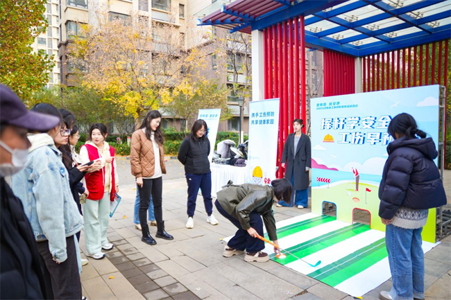 活动现场的两大工伤预防游戏区人气高涨,居民踊跃参与。闯关答题区中,参与者掷骰子定步数,棋盘格子对应办公室防护、高空作业安全等场景考题,大家认真思考作答,答对可获小礼品,在趣味闯关中掌握知识;“安全投‘防’战”区里,居民用印有防护知识的沙包投掷标注心肺复苏、用电安全等知识点的靶心,命中后志愿者现场解读,让枯燥条文变实用常识,加深记忆。