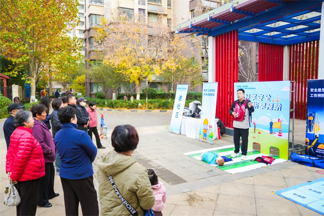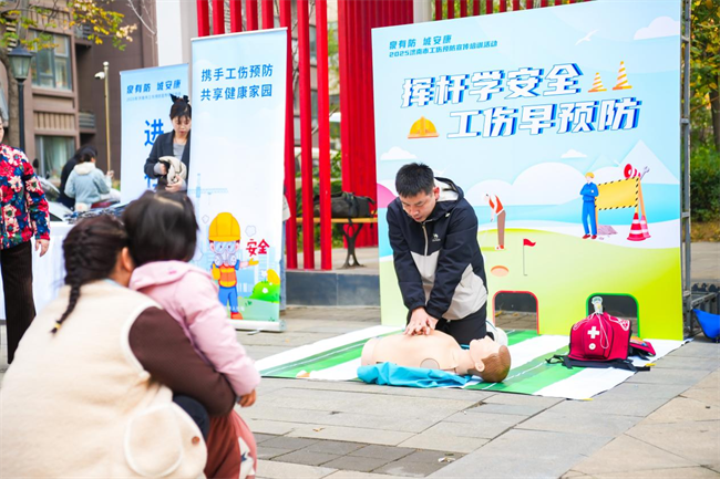 为让工伤预防知识走进日常生活,切实提升居民安全防范意识与应急处置能力,11月14日,由济南市人社局主办的“泉有防城安康”2025济南市工伤预防宣传活动走进鑫苑花园公馆社区,以趣味游戏+实操体验的形式,将专业知识与贴心服务送到居民“家门口”,让安全理念深植人心。