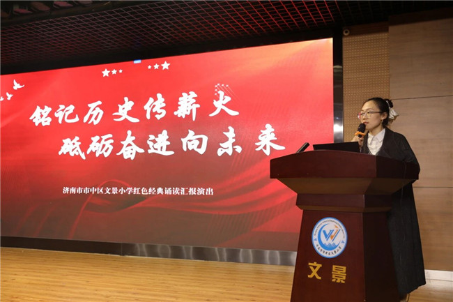 为引导广大少先队员铭记光辉历史、传承红色基因,激发爱国情怀与奋斗精神,2025年11月12日,济南市市中区文景小学隆重举行“铭记历史传薪火·砥砺奋进向未来”红色经典诵读汇报演出活动。学校师生与“英雄山薪火”宣讲团嘉宾、社区代表齐聚一堂,共同聆听红色经典,缅怀革命先烈,凝聚奋进力量。
