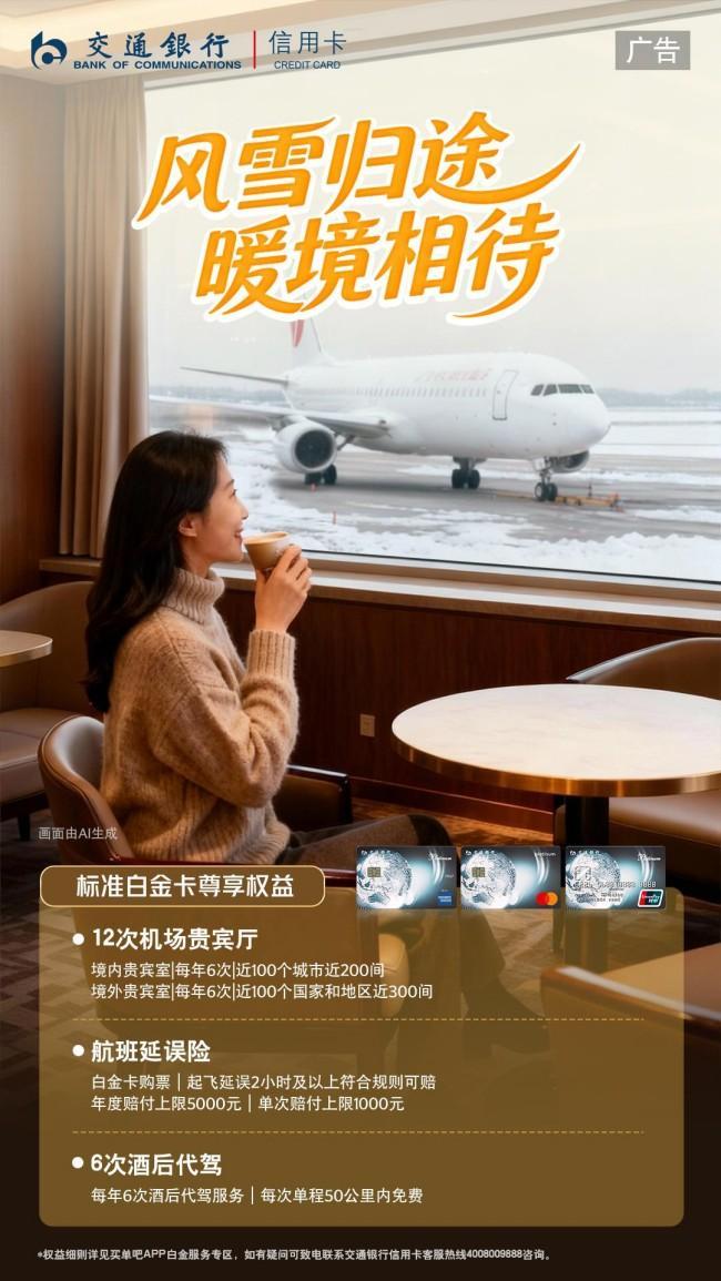 寒潮来袭?别怕!风雪途中有交通银行信用卡给你“暖 buff”加持,在奔赴与抵达之间,在匆忙与期待之中,每个转场的间隙,都有温暖如约而至。从贵宾礼遇到延误保障再到安心抵达,交通银行标准白金卡旨在为你打造舒心旅程,让每一次出发与归来,都多一份从容与暖意。