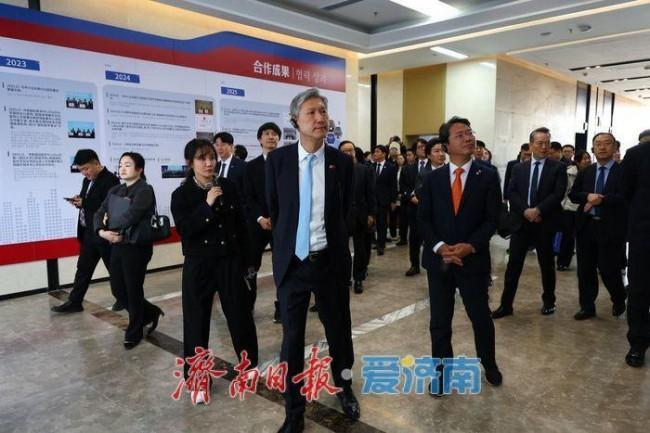 正值2025中国(山东)—韩国友好周暨鲁韩经贸交流会在济南召开之际,11月19日,韩国驻华大使卢载宪率代表团一行赴济南国际医学中心参观交流。此次访问旨在实地考察中韩医疗健康领域合作成果,共同探讨中韩医学合作创新发展路径。济南市政协主席雷杰,市人大常委会副主任、槐荫区委书记、医学中心党工委书记孙常建,省委外办副主任李红等陪同参观。来自希杰集团、现代汽车、SK集团、大韩航空、三星电子等韩国著名企业代表等共计80余人参加活动。