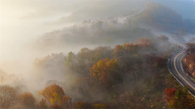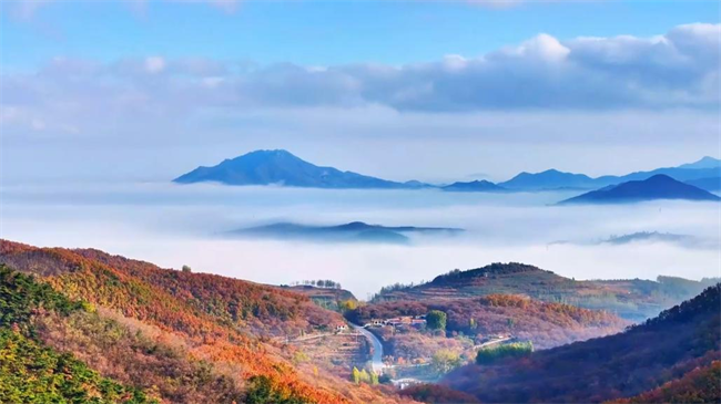 蓝天如洗,云海似涛,远山在云雾中若隐若现,山间层林尽染,红橙黄绿交织成斑斓画卷。张宁/摄