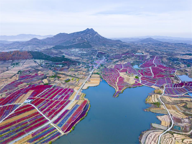 初冬的日照山间,是一幅灵动的画卷。远山在云雾中若隐若现,宛如仙境。山间层林尽染,红橙黄绿斑斓交织;山脚湖畔,蓝莓田如大地调色盘,深浅绯红交织成海,如霞似火。田野、湖泊、远山绘就冬季独有的浪漫诗意。
