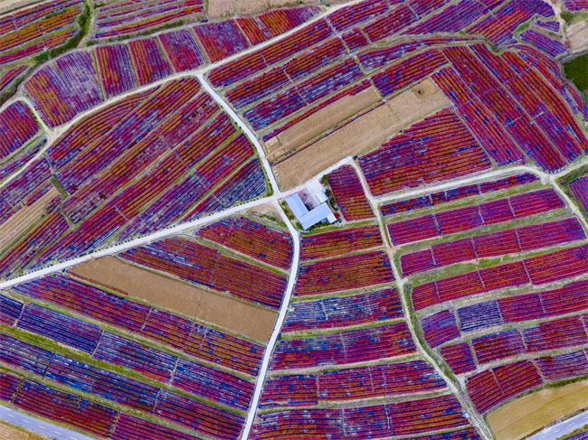 大片蓝莓园仿若大自然打翻的调色盘,深浅交织的色彩肆意铺陈。胡明刚/摄