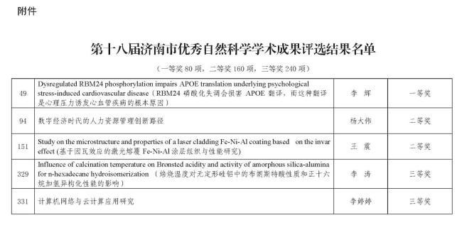 生物工程学院教师李辉的《Dysregulated RBM24 phosphorylation impairs APOE translation underlying psychological stress-induced cardiovascular disease(RBM24磷酸化失调会损害 APOE翻译,而这种翻译是心理压力诱发心血管疾病的根本原因)》获得一等奖;管理学院教师杨大伟的《数字经济时代的人力资源管理创新路径》,城市轨道学院教师王震的《Study on the microstructure and properties of a laser cladding Fe-Ni-Al coating based on the invareffect(基于因瓦效应的激光熔覆Fe-Ni-A1涂层组织与性能研究)》获得二等奖;生物工程学院教师李涛的《Influence of calcination temperature on Bronsted acidity and activity of amorphous silica-alumina for n-hexadecane hydroisomerization(焙烧温度对无定形硅铝中的布朗斯特酸性质和正十六烷加氢异构化性能的影响)》,新一代信息技术学院教师李婷婷的《计算机网络与云计算应用研究》获得三等奖。