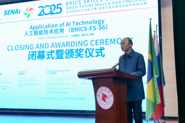 赛项组委会主任、金砖国家职业技能大赛中方竞赛办公室一处副处长白海翔,宣布2025金砖国家职业技能大赛人工智能技术应用赛项国际总决赛圆满闭幕。