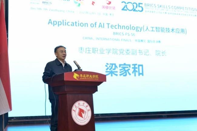 枣庄职业学院党委副书记、院长梁家和在致辞中表示,学院高度重视人工智能等新兴技术领域的人才培养与产业对接,此次承办赛事是落实推动金砖国家职业教育协同发展的重要举措。作为承办单位,学院将以高标准赛事组织、高质量服务保障,全力打造一场精彩有序、富有影响力的技能盛会,为参赛选手搭建切磋技艺、共同提升的优质平台,助力人工智能技术在各领域的创新应用与人才储备。