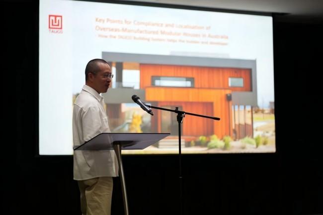 作为本次推介会的核心环节,行业专家们的分享为现场观众带来了极具实操性的干货内容。TAUCO Australia Pty Ltd董事长黄海涛围绕“海外模块化建筑在澳洲的合规落地路径”展开系统讲解,从建筑法规体系、澳标适用要求、材料与部品认证,到证据链管理、规划施工审批、生产质量管理等多个关键维度,全面解析了海外模块进入澳洲市场的核心要点。他强调,建立可审查、可追溯、可存档的技术与认证资料体系,是确保工程顺利通过审批、获取入住许可的关键前提。Cre8ive Building Concepts PTY LTD董事Martin Morrow-Woods结合澳洲本地施工与设计管理的实际情况,聚焦模块化建筑落地实施阶段的关键流程,进行了深入分享。他详细介绍了现场吊装统筹、结构与机电系统接口衔接、第三方专业审查流程、竣工合规文件编制、阶段性验收节点规划等实操环节,并依托自身在住宅及中密度建筑项目中的丰富实践经验,对施工过程中的合规把控、风险防范及最终交付标准等核心问题,给出了极具指导性的解读,为参会企业提供了一套拿来即用的落地实施参考方案。