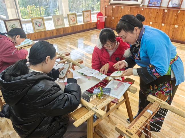 重庆市级“乡村工匠”麻兴姐正在教学生苗绣技艺。(新华社记者周凯摄)