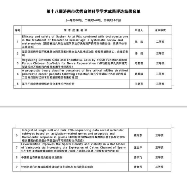 近日,第十八届济南市自然科学学术成果奖评选结果正式揭晓。济南市人民医院凭借扎实的科研积淀与持续的创新能力,共荣获9项奖励,包括二等奖1项、三等奖8项,实现了获奖数量与质量的双重提升,充分展现了医院在自然科学研究领域的深厚实力与良好发展态势。