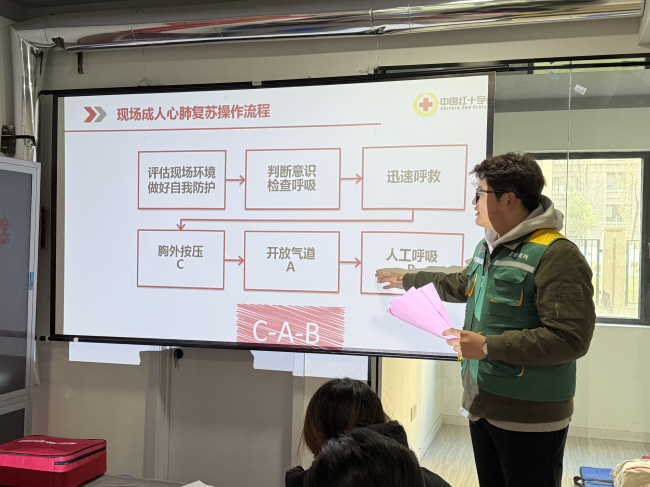 活动现场,启明星应急救护社团志愿者以心肺复苏(CPR)、自动体外除颤仪(AED)操作技能为核心,展开全方位讲解教学。借助AI辅助工具,志愿者将专业急救操作的复杂流程可视化、通俗化,有效打破非专业人员的认知门槛,让“黄金4分钟”急救知识真正走进社区、落地生根。讲解过程中,志愿者手把手指导居民进行心肺复苏实操演练和AED模拟操作,针对气道异物梗阻急救场景,运用“剪刀、石头、布”口诀化教学,直观演示海姆立克急救法的动作要领,现场互动氛围热烈。